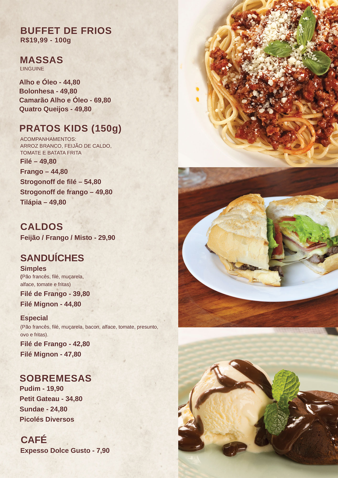 Buffet de Frios | Massas | Pratos Kids | Caldos | Sanduíches | Sobremesas | Café